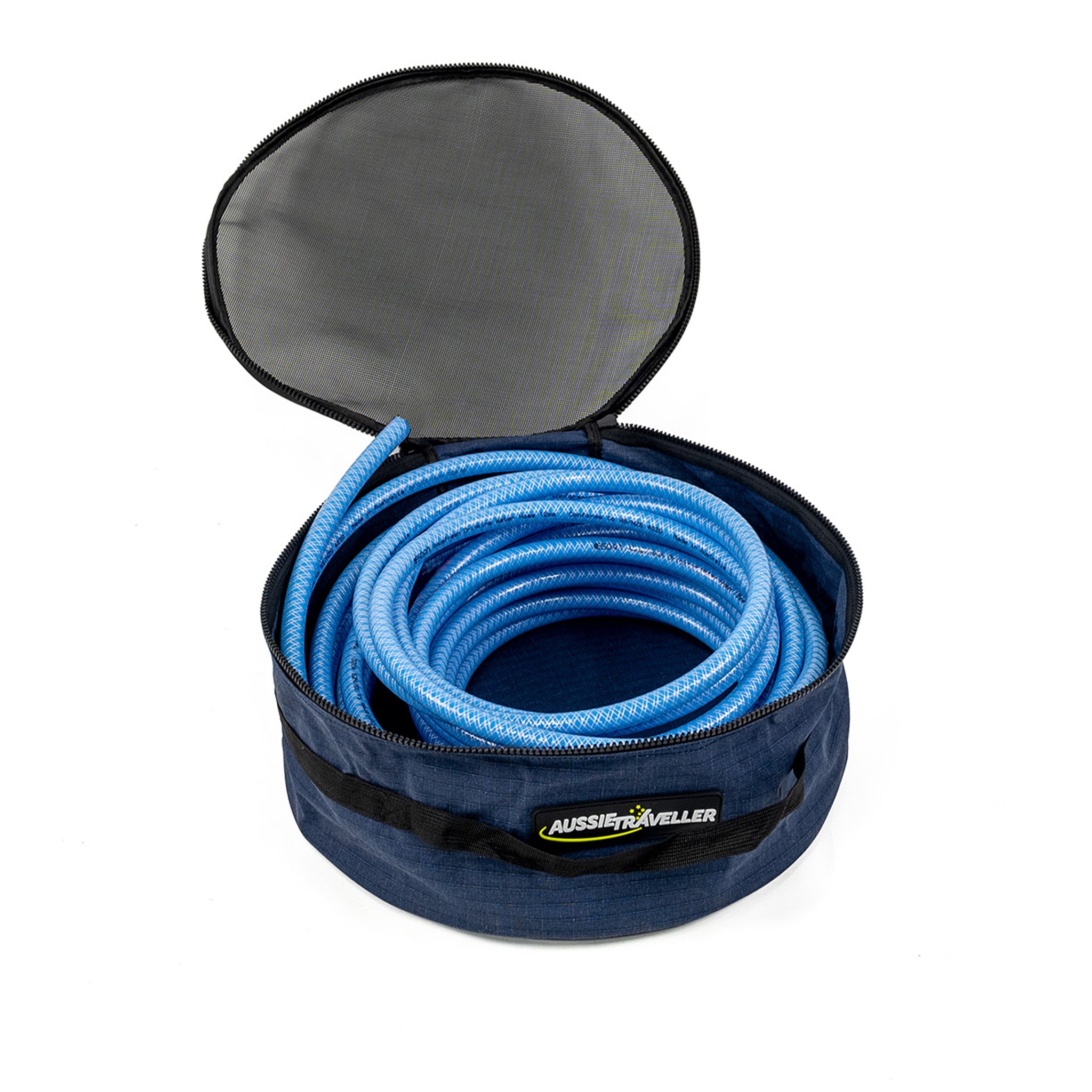The Aussie Traveller Mesh Top Hose Bag is designed to store water hoses and keep them tidy and tangle free while on the move. The robust mesh lid allows air flow for drying of residue water, whilst the heavy duty Ripstop canvas ensures your hose stays protected.