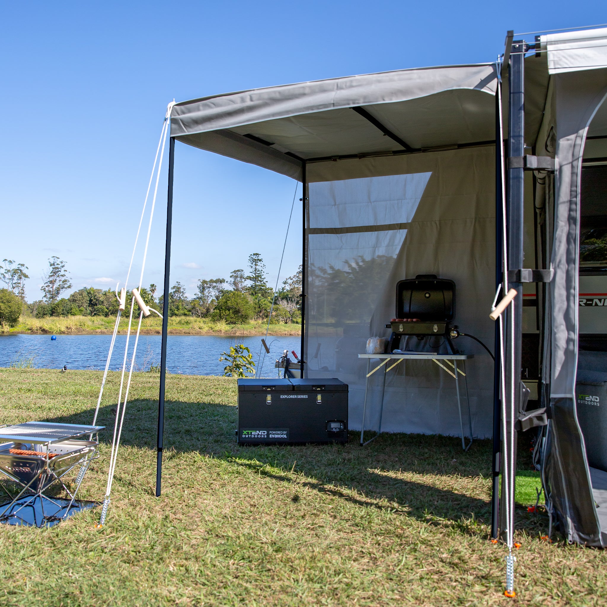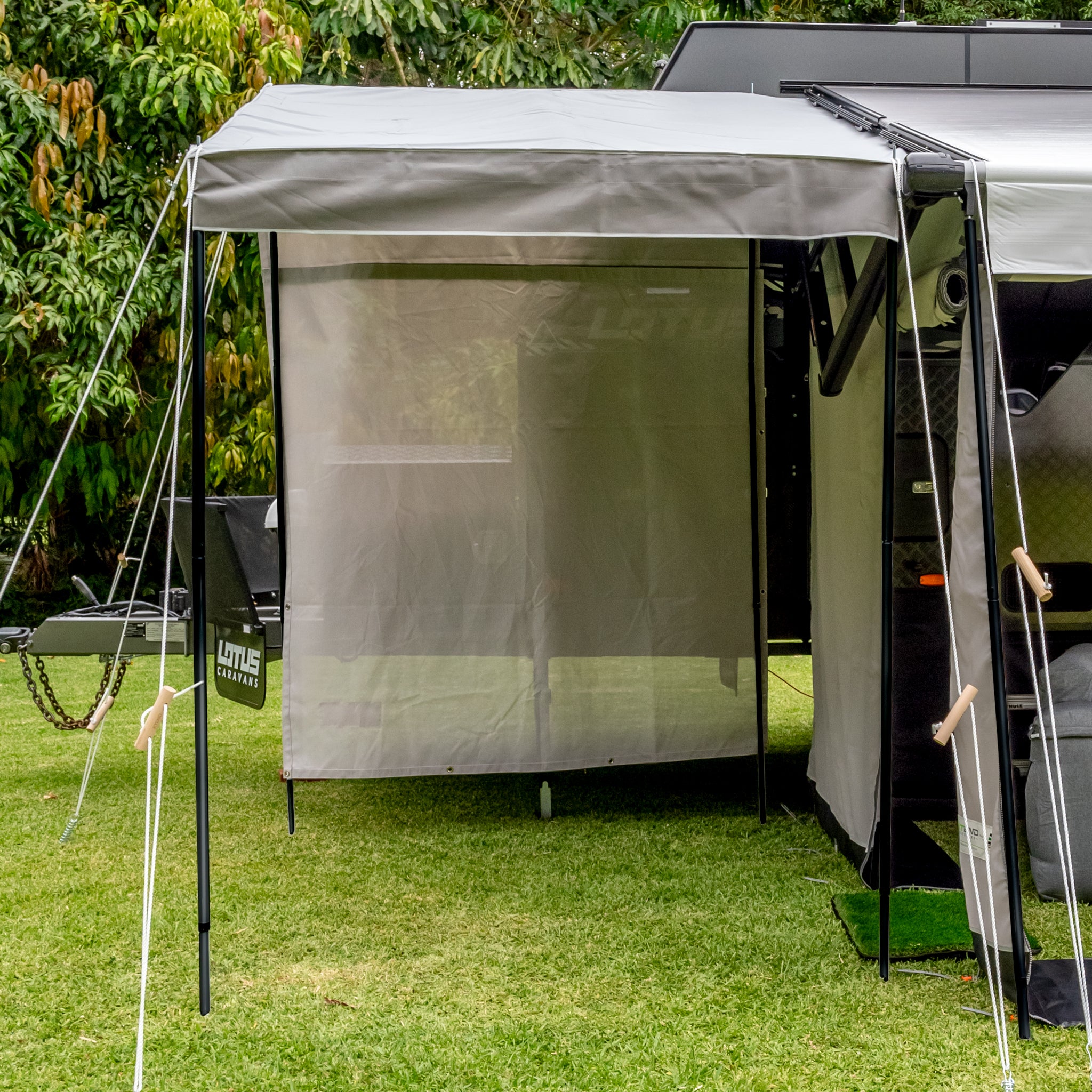 Manufactured from our premium shade mesh, this porch wall provides privacy and is designed to stand up to the elements. This easy set up shade wall uses Velcro to attach onto either the front side of the porch or back caravan side.