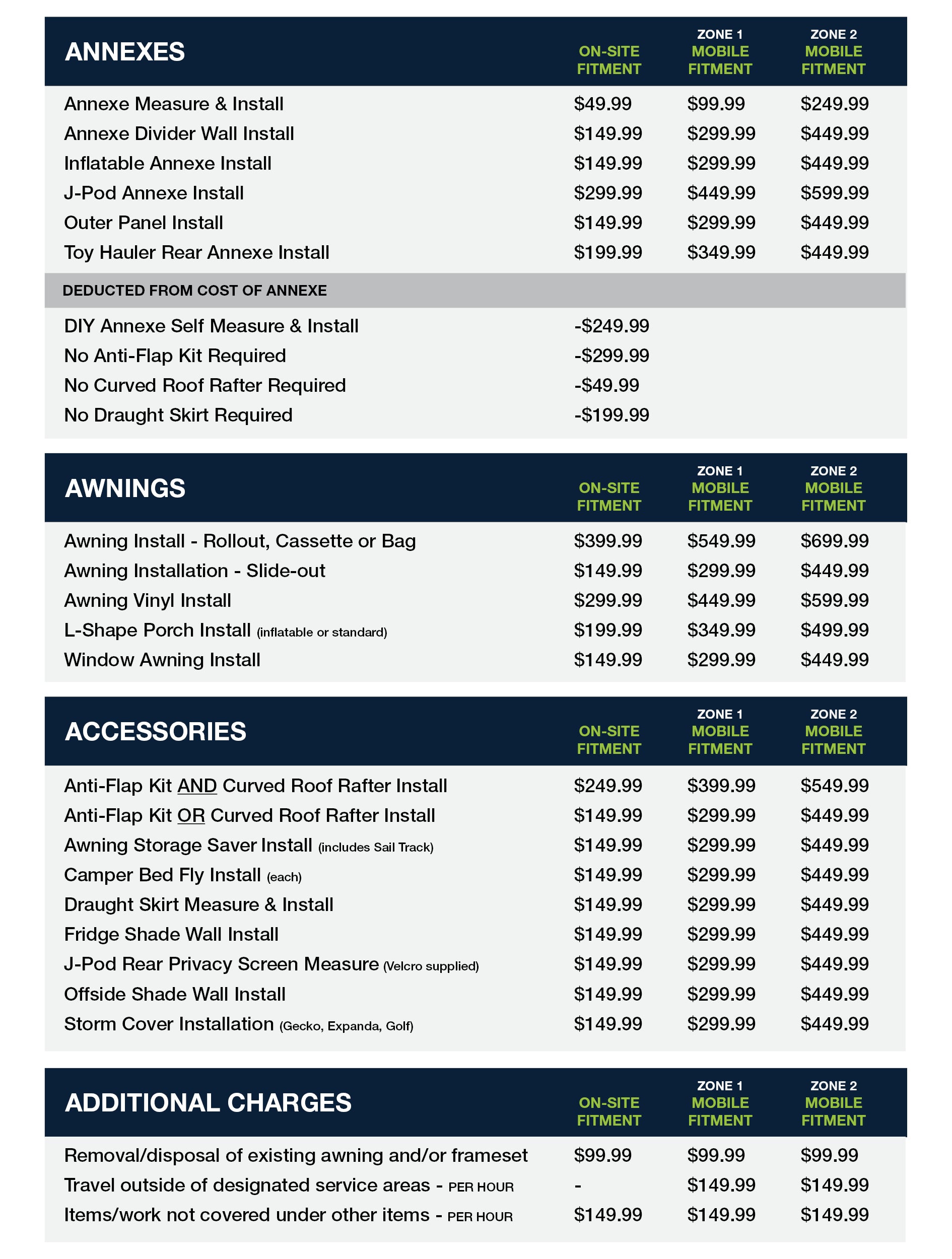 - For Awnings, Annexes, Vinyl Replacements a $400 deposit will be required for all sites where a fitment needs to occur, in order to confirm commitment from the customer. The deposit will be taken off the customers final invoice amount.